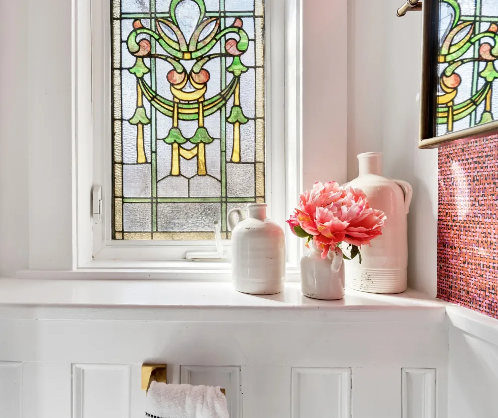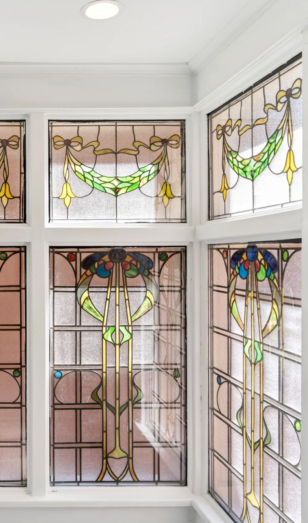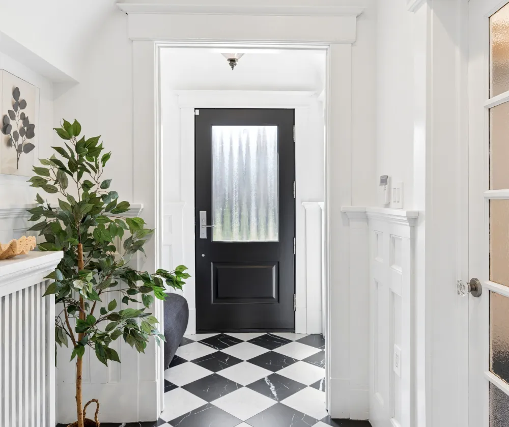 The entry introduces the home with confidence, turning each arrival into a distinct moment. Patterned tile underfoot and glimpses of stained glass offer an immediate sense of character, while a discreet powder room and walk-in closet are thoughtfully integrated for function.