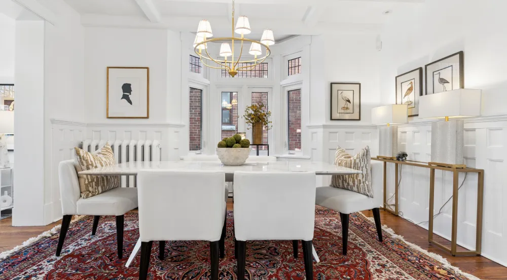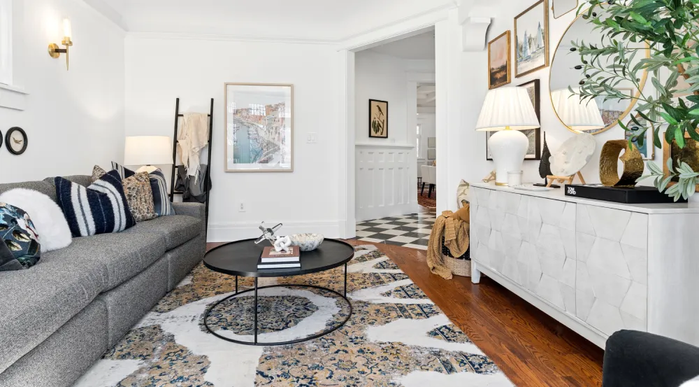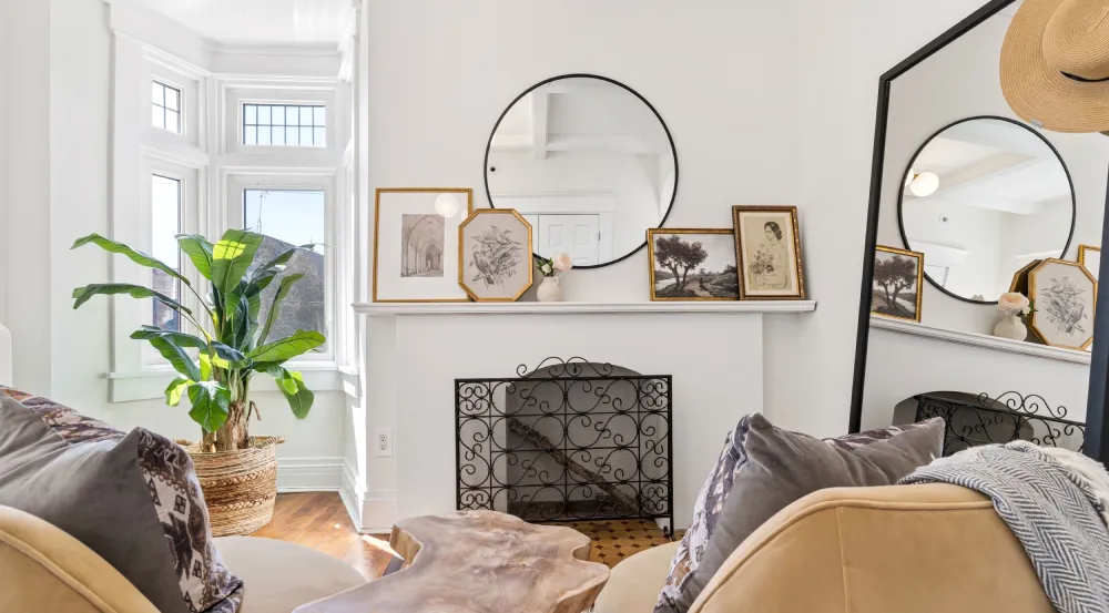 Anchored by a south-facing bay window, the living room carries a sense of openness and ease. Original hardwood floors and artistic details bring depth and texture, while the proportions allow for both relaxed evenings and more social, connected moments.