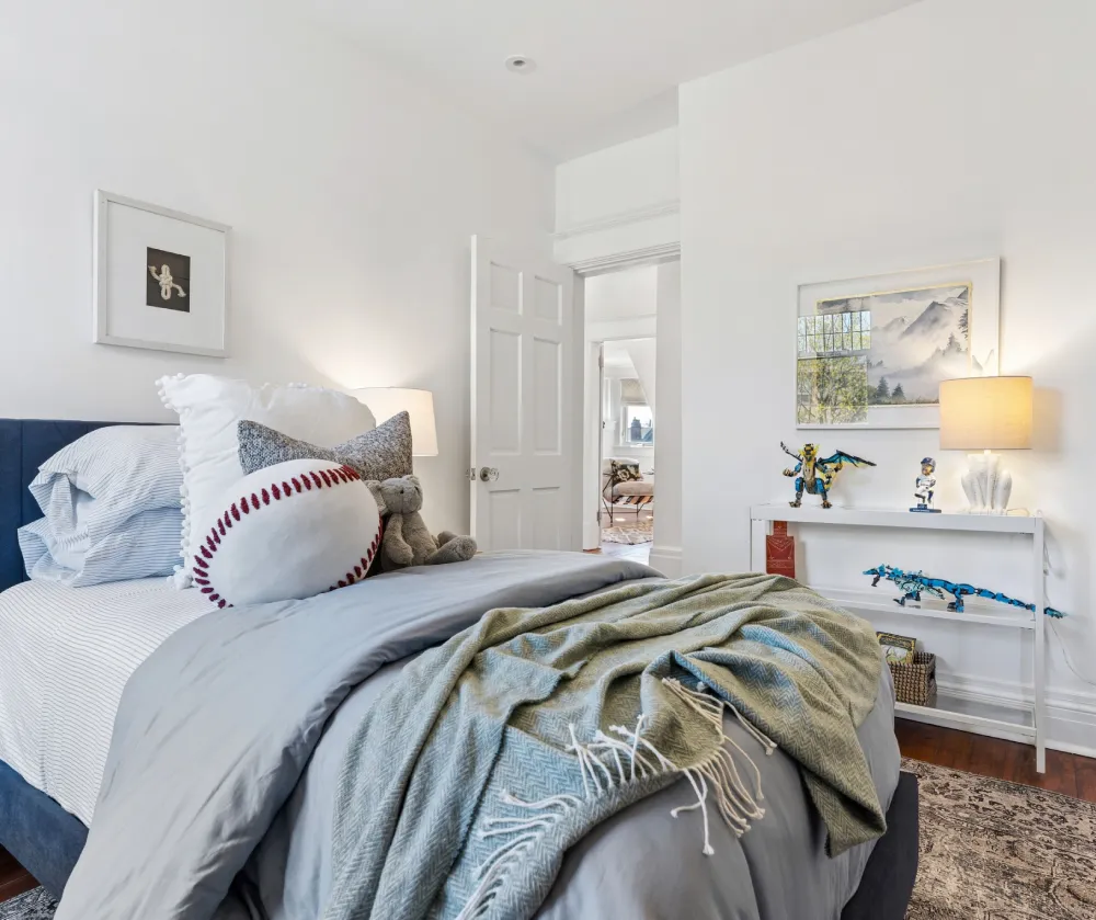 The primary suite extends into a dedicated sitting room, adding a rare second zone with space to read, dress, or settle in by the fireplace. Just beyond, the bathroom is thoughtfully positioned to support daily routines with ease and privacy.