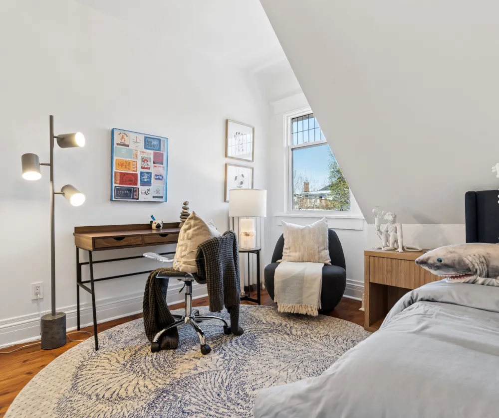 Tucked beneath the roofline, the third floor opens into a surprisingly expansive room that can shift easily between guest space, studio, lounge, or private work area. A full bathroom across the hall makes the level feel complete and self-contained.