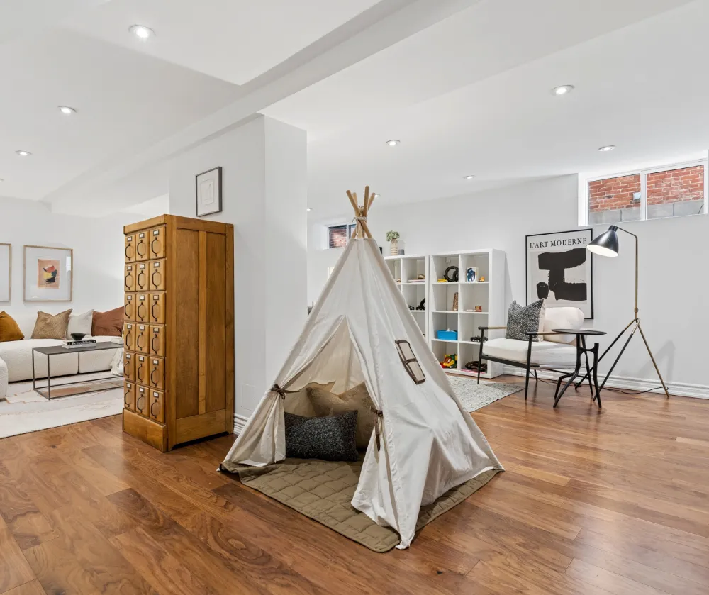 The finished lower level extends the home with practical spillover space for media, recreation, fitness, or play. Open and well-finished, with a full bathroom nearby, it adds another usable layer to the home’s day-to-day rhythm.