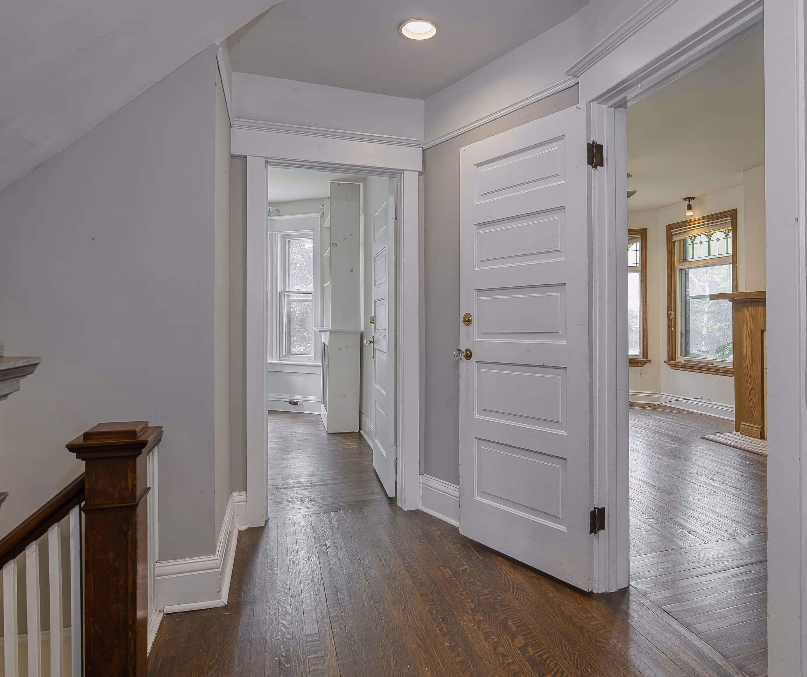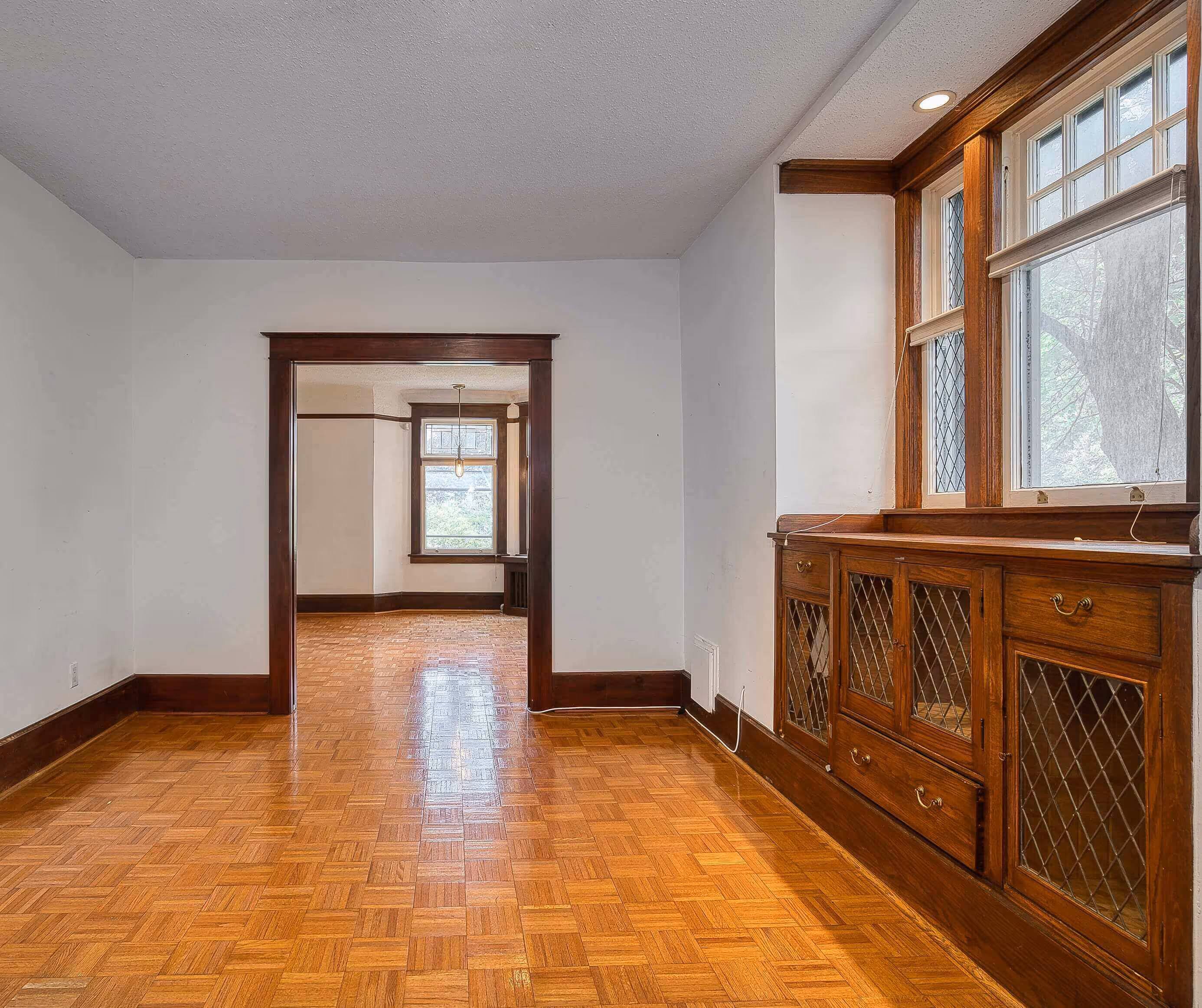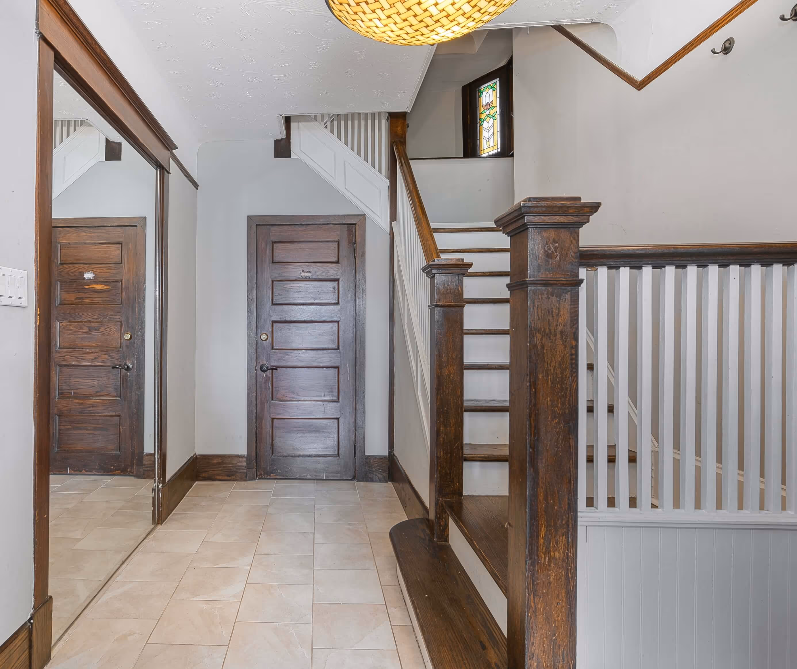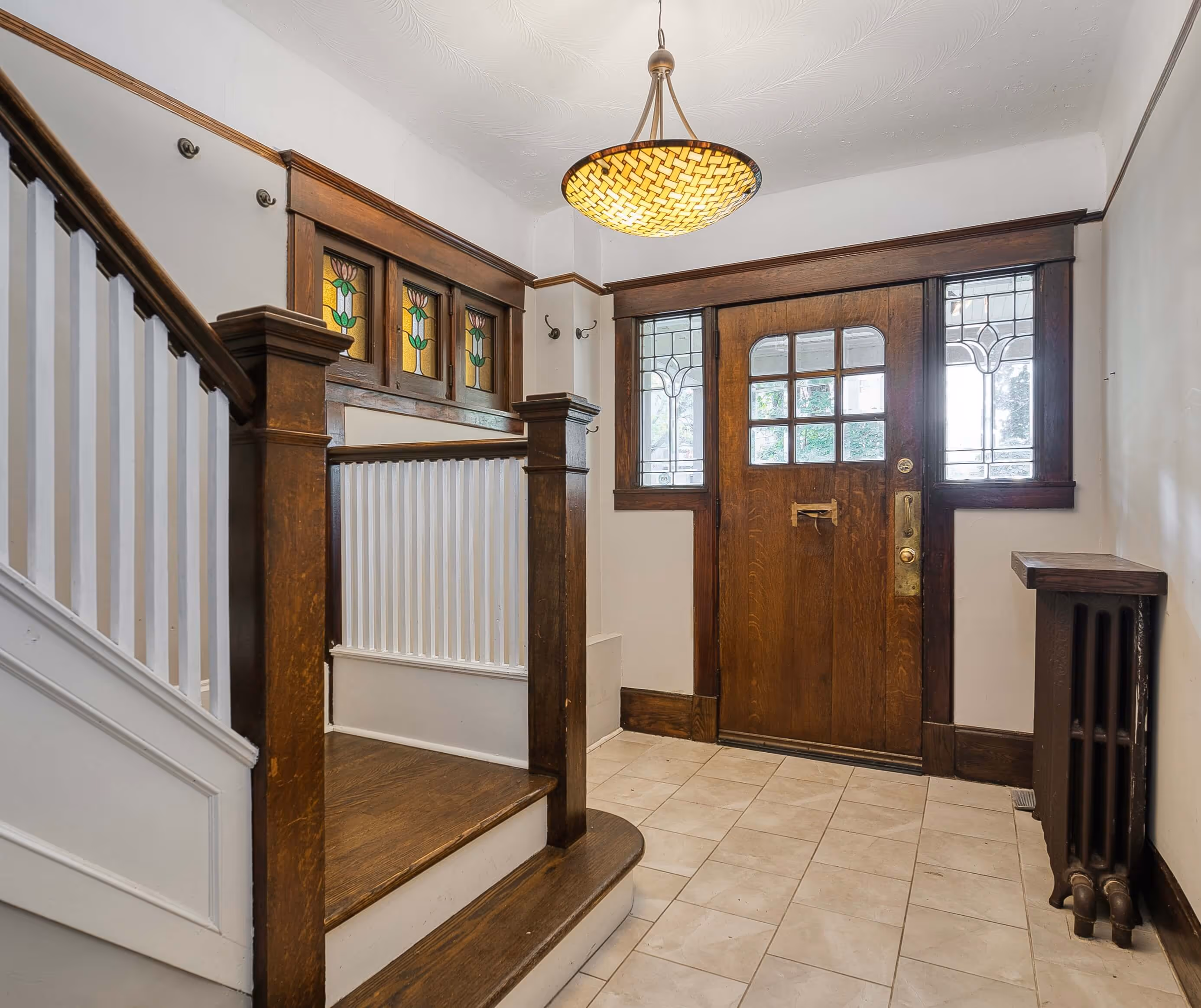 Framed by mature trees and timeless brickwork, this Edwardian duplex showcases its charming character on a sunny corner lot. Inside, the foyer reveals original millwork, stained glass, and a gracious staircase—classic details that reflect its 1911 craftsmanship and set the tone for a home rich in history and warmth.