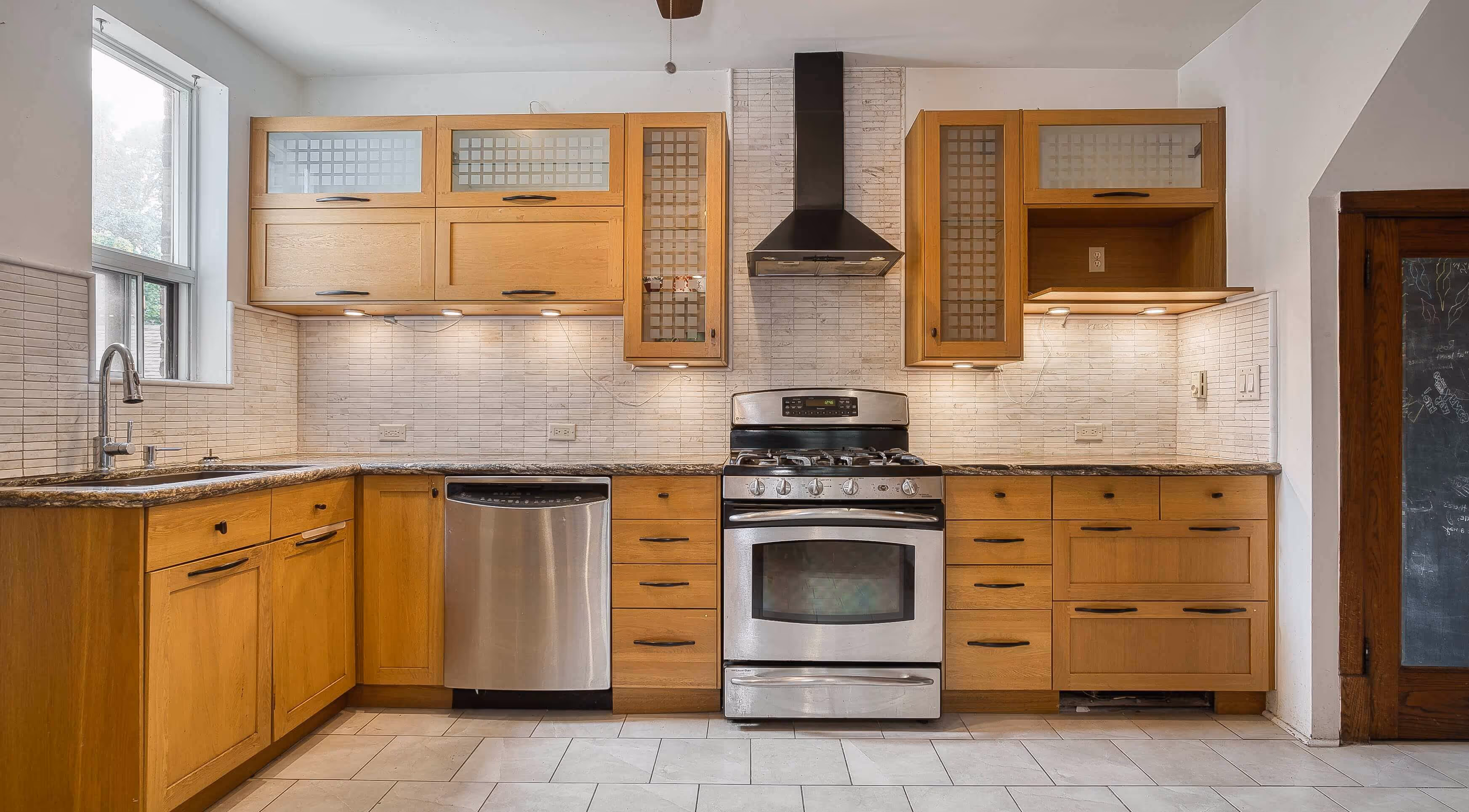 With its private rear entrance, the main-level unit offers space, warmth, and traditional detailing. The large kitchen features granite counters and stainless appliances, while the formal dining room—framed in original wood—anchors the home with classic, inviting charm.