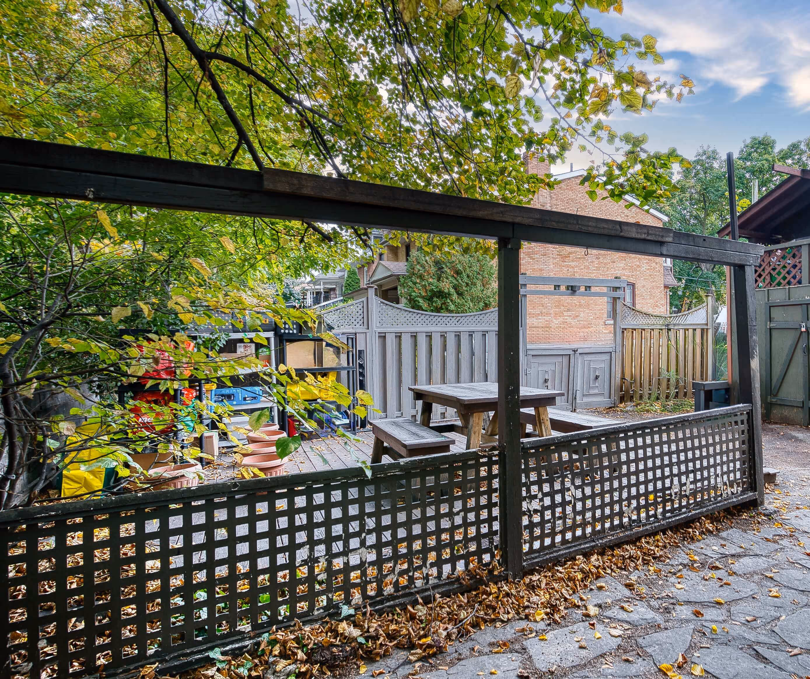 A wide wooden deck beneath mature trees creates a quiet outdoor retreat. Whether hosting a summer dinner, enjoying morning sun, or simply unwinding in the shade, this private backyard offers rare calm and space in the heart of the city.