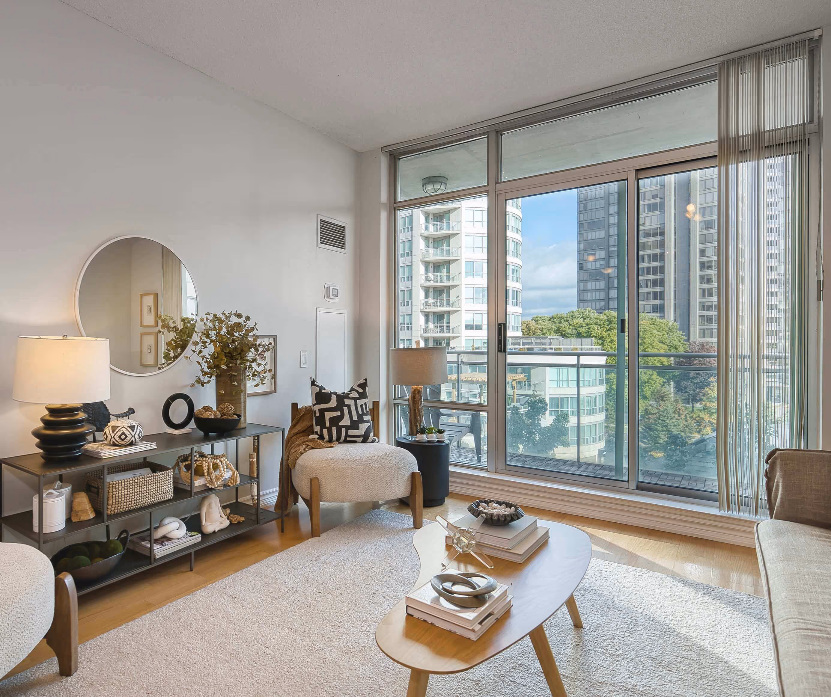 Framed by floor-to-ceiling windows, the open living space is filled with natural light and a gentle sense of flow. Here, mornings begin in calm brightness, and evenings wind down with city views and quiet warmth—where contemporary design meets a feeling of true ease.