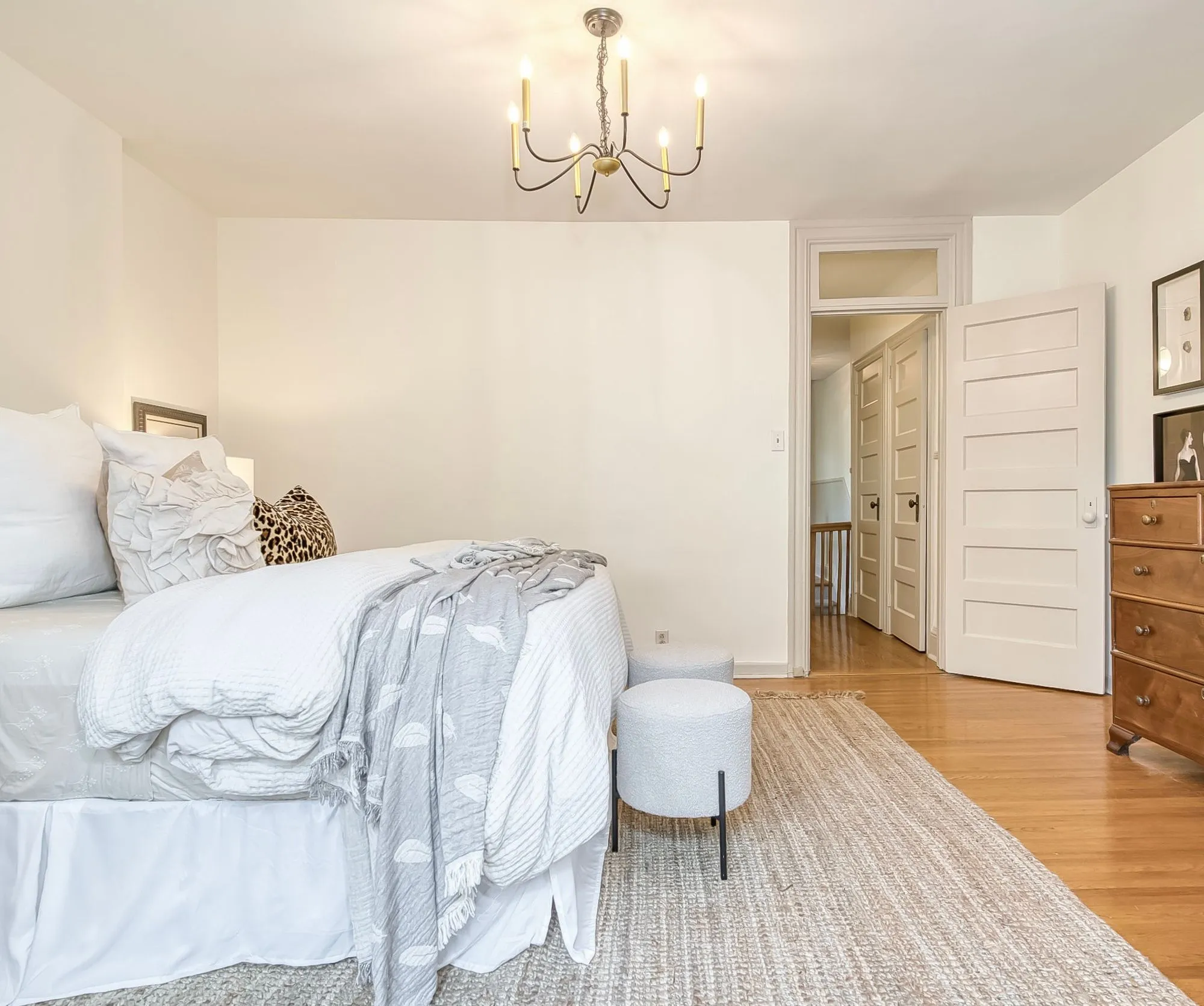 The primary bedroom offers a serene blend of comfort, calm, and elegance. Bathed in natural light from the charming bay windows, the room feels open and inviting, with plenty of space for restful nights and peaceful mornings. The soft, neutral palette enhances the tranquil atmosphere, making it an ideal retreat from the bustle of daily life.