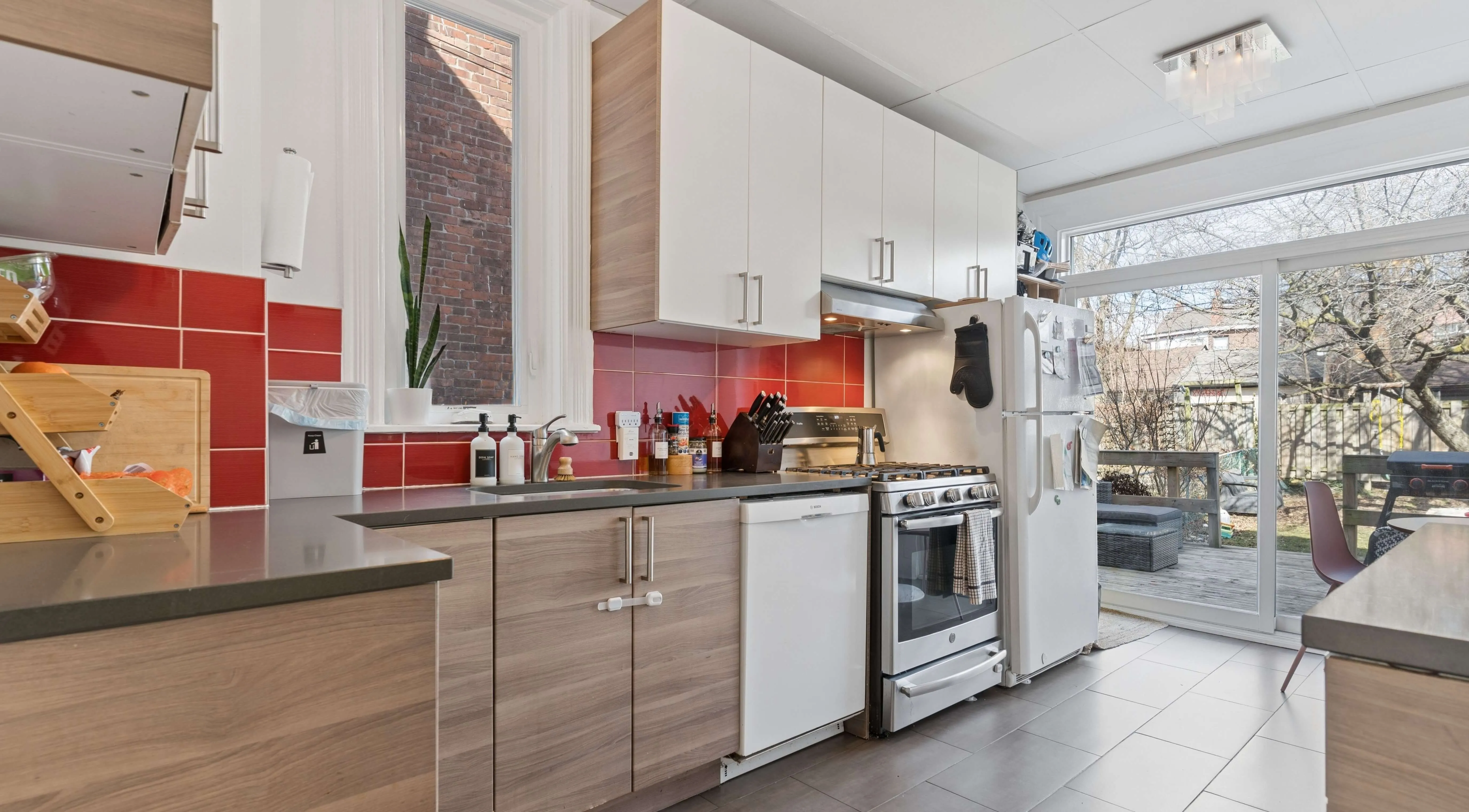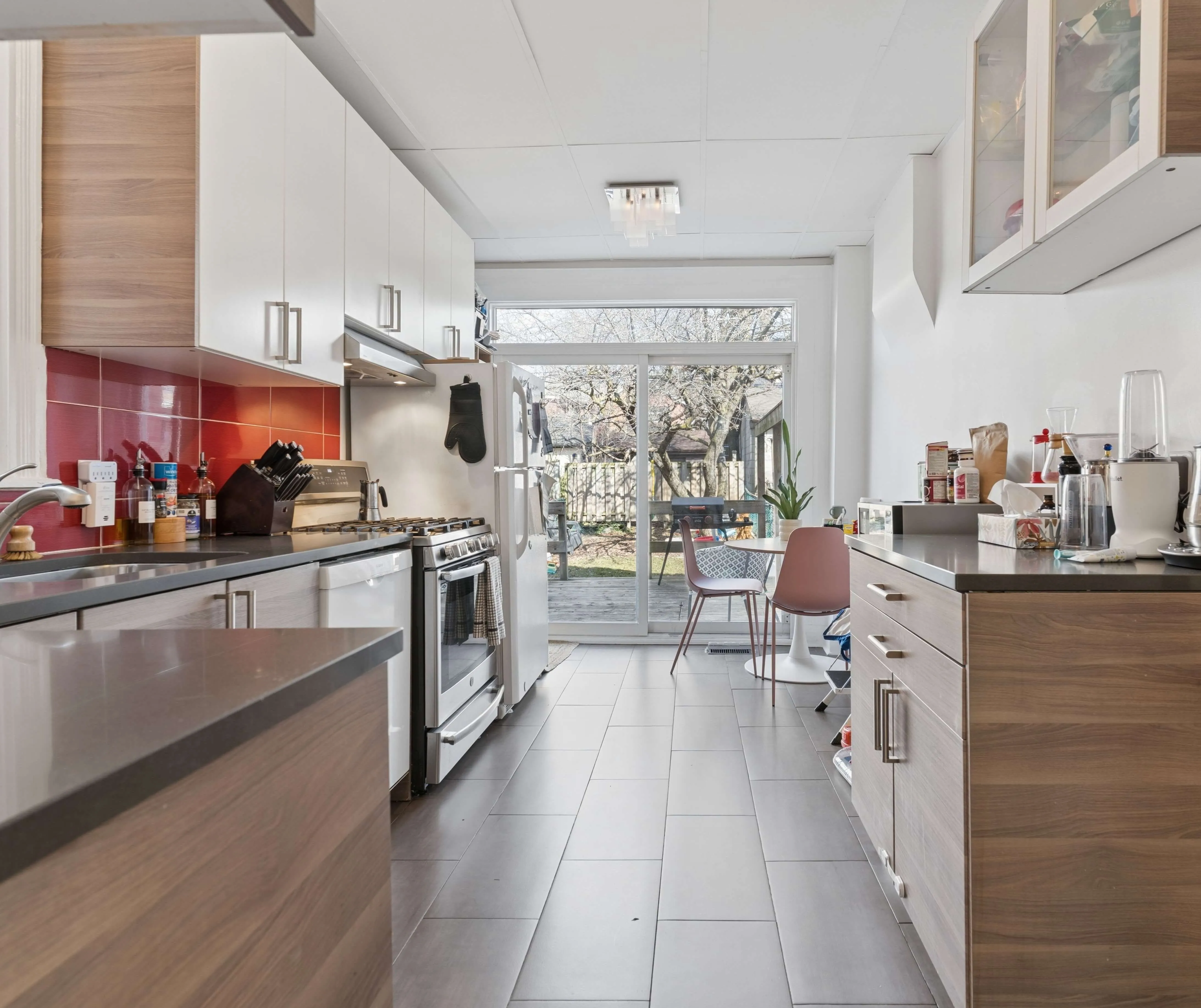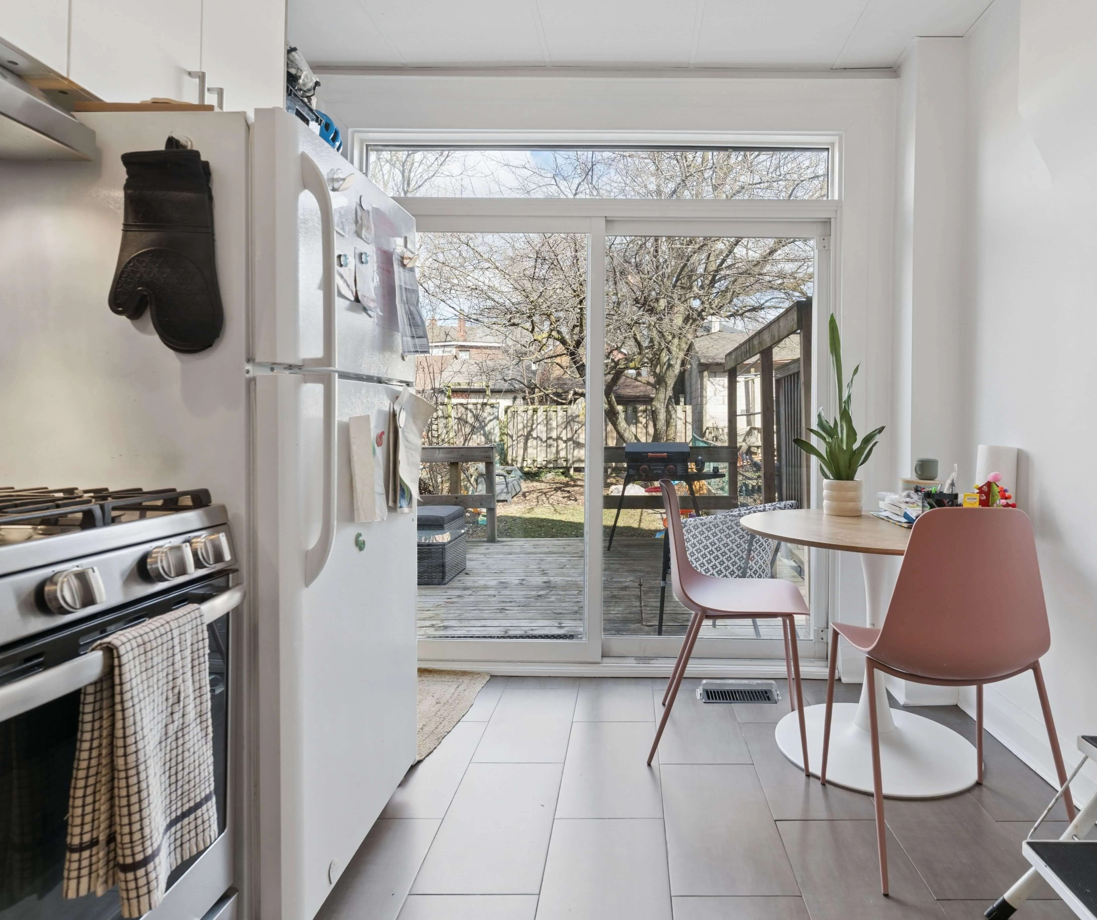 The dining room sits between the living room and kitchen, creating a natural gathering space at the centre of the home. At the back, the renovated kitchen is lined with wall-to-ceiling windows and offers plenty of storage and counter space, while the breakfast nook overlooks the backyard and leads out to the deck.