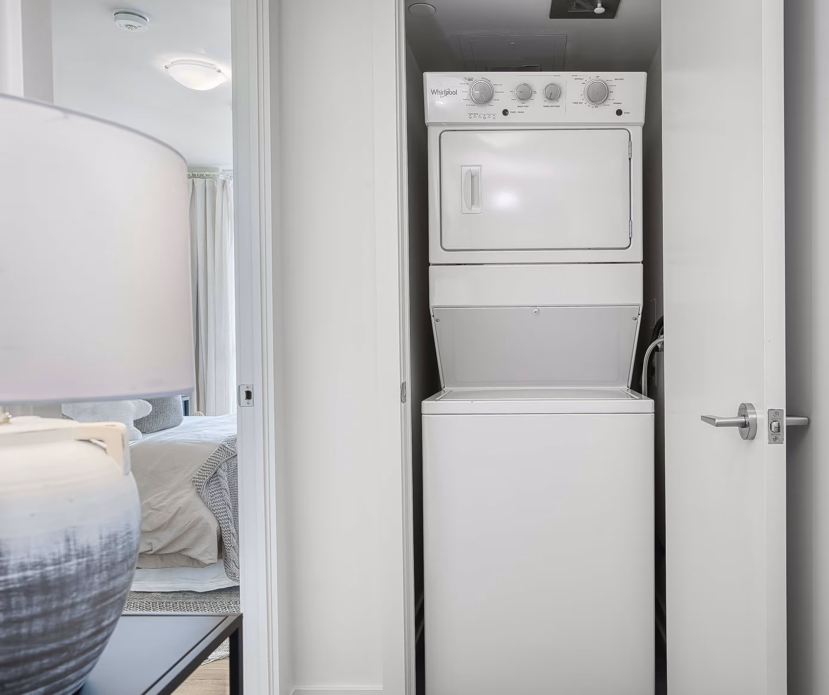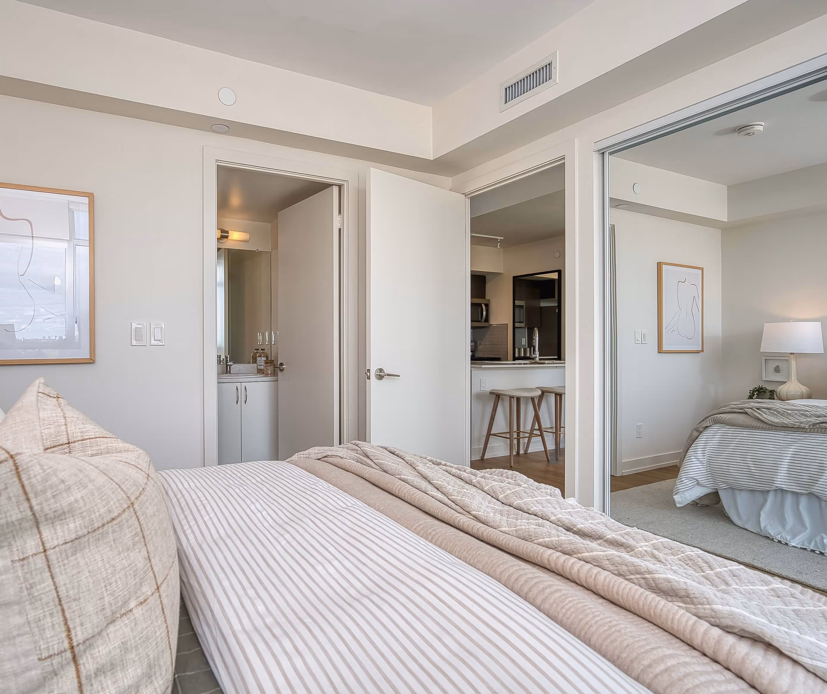 Two additional bedrooms offer flexibility for family, guests, or work-from-home life. Each space is bright, private, and thoughtfully separated by a split layout that enhances flow and comfort. A second full bathroom, in-suite laundry, and ample storage ensure easy, balanced city living.