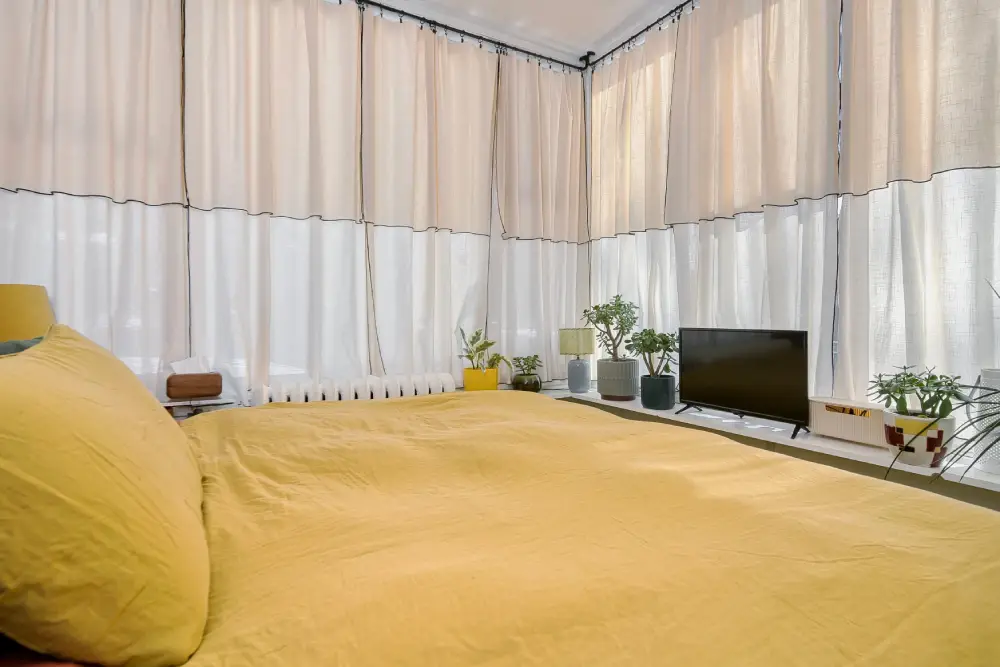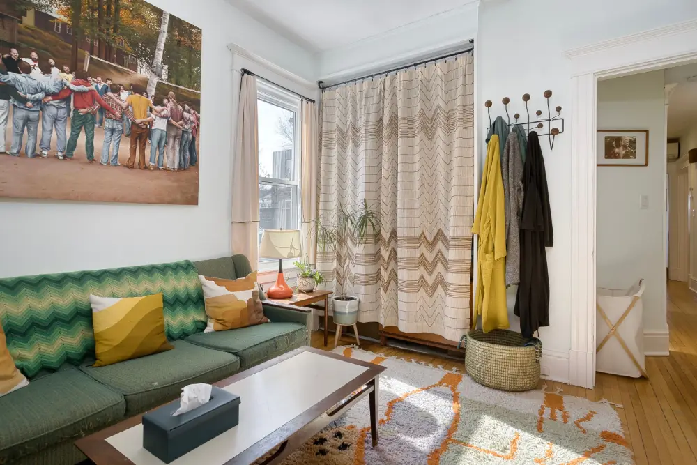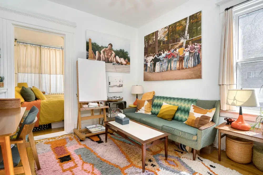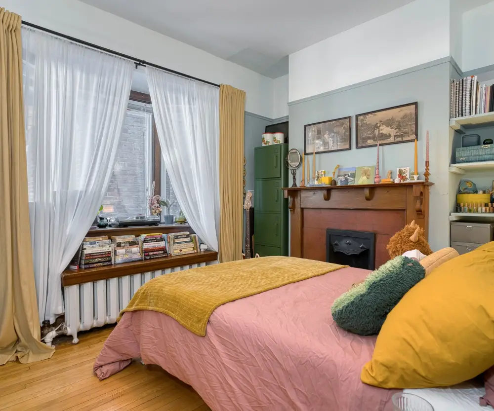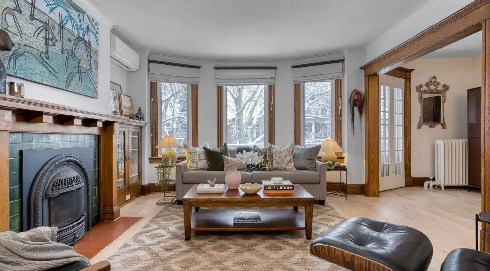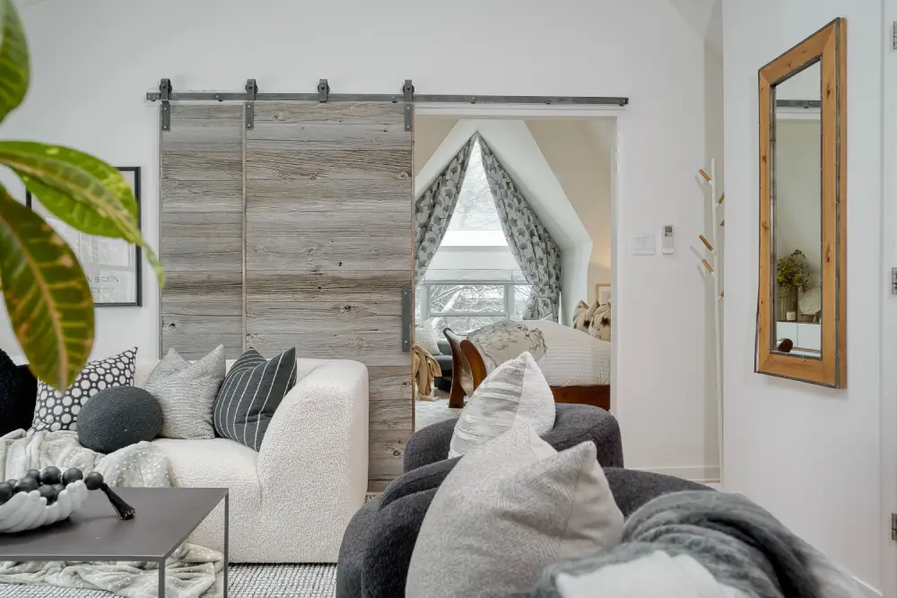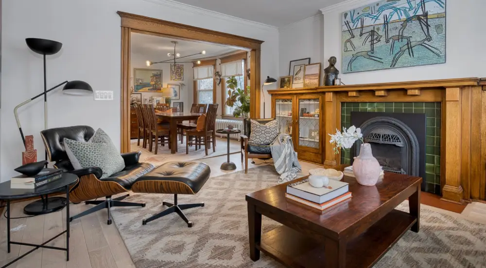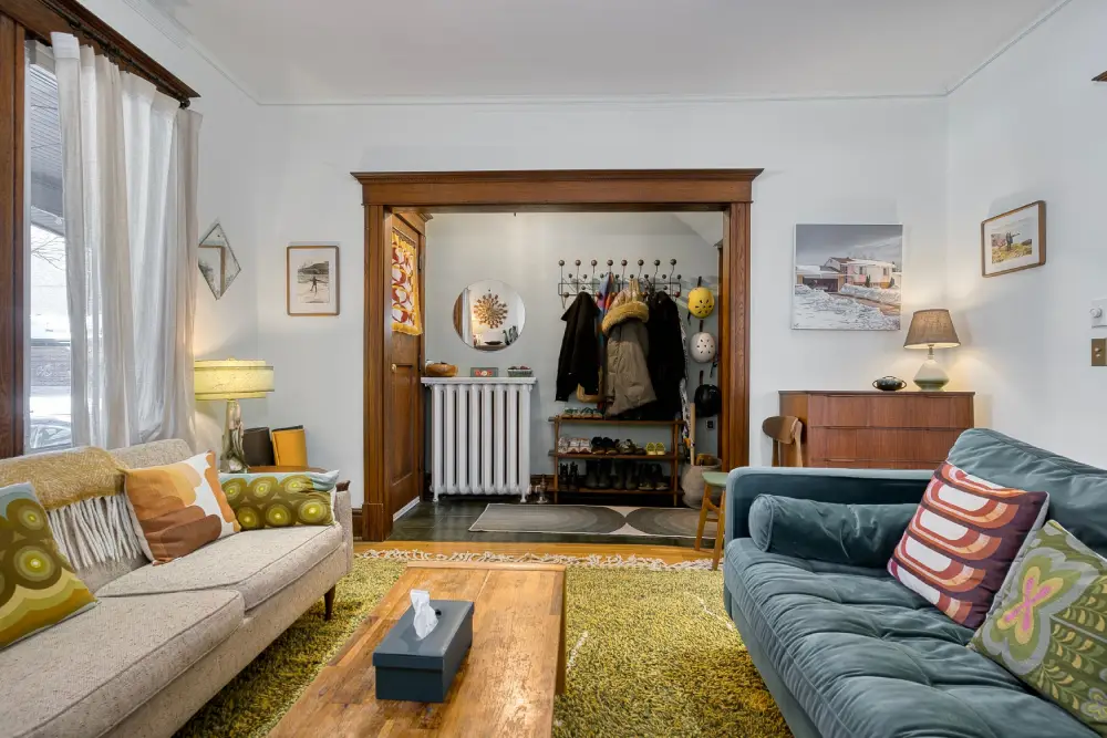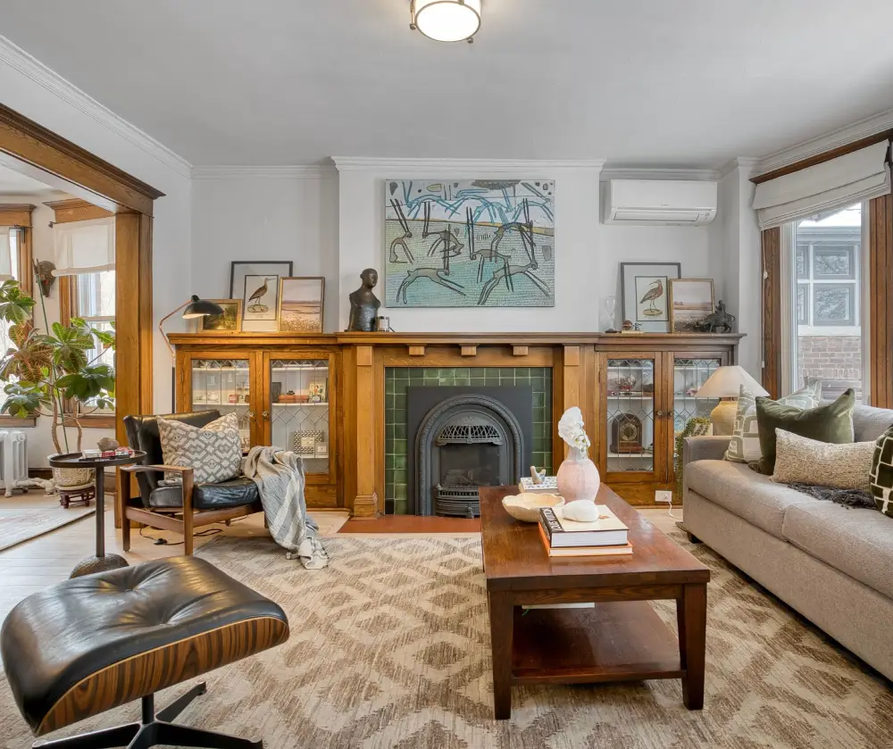 Back on the main floor, the suite opens with an inviting living room where vintage woodwork meets colourful, collected décor, creating a space that feels instantly lived-in and comforting. Large windows brighten the room throughout the day, while the fireplace wall anchors cozy evenings spent reading, relaxing, or gathering with friends and family.
