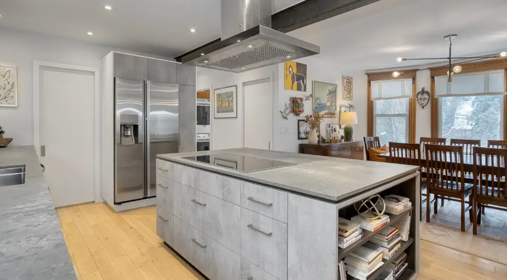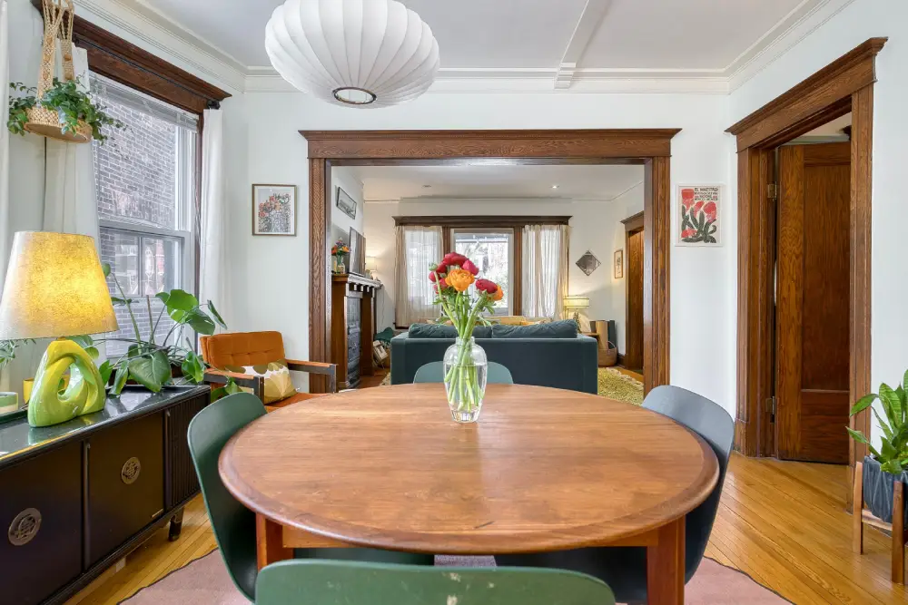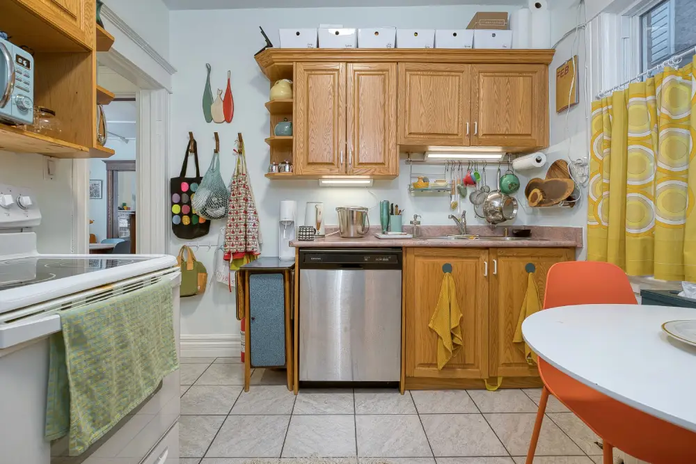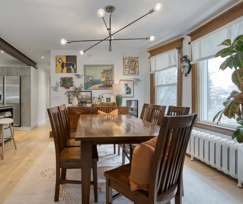 The main floor dining room invites warmth, shaped by large windows and a welcoming flow that naturally gathers people around the table. Nearby, the intimate kitchen offers a cheerful ease—perfect for lingering over morning coffee or preparing dinners with friends.