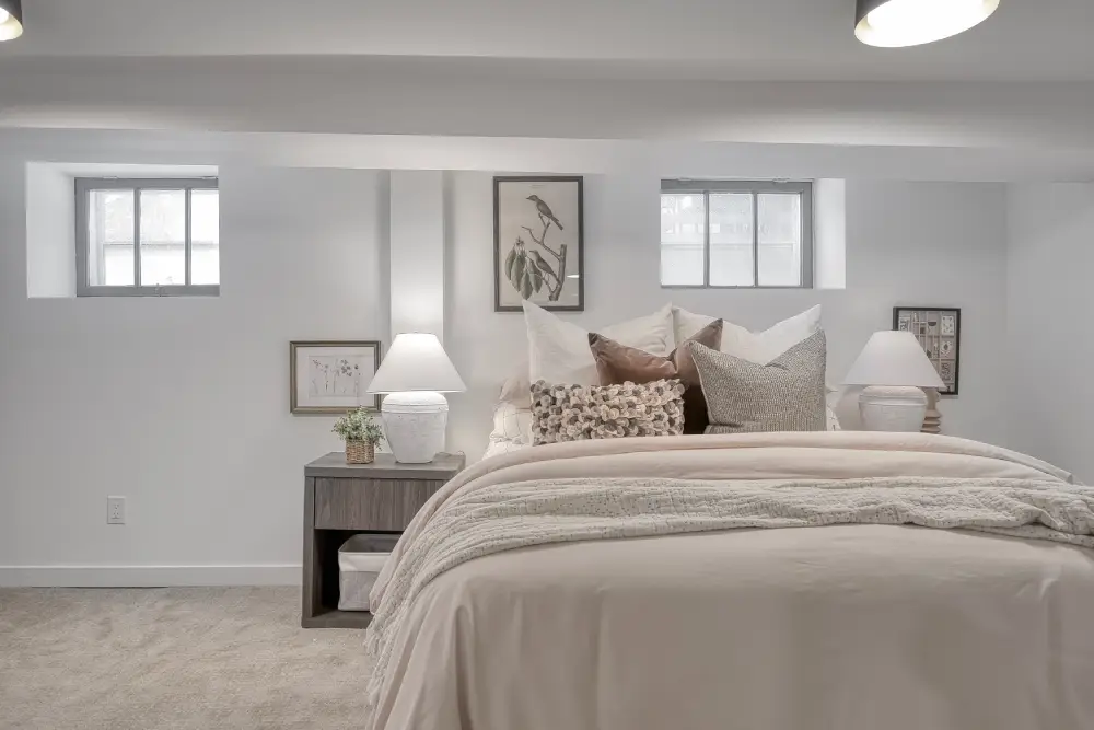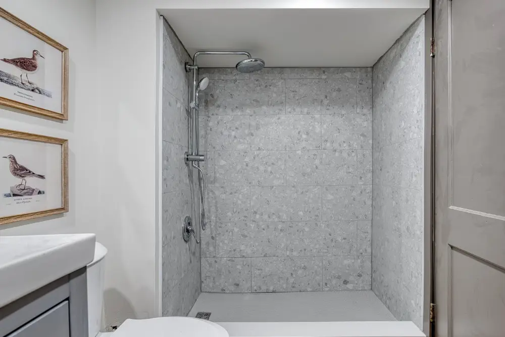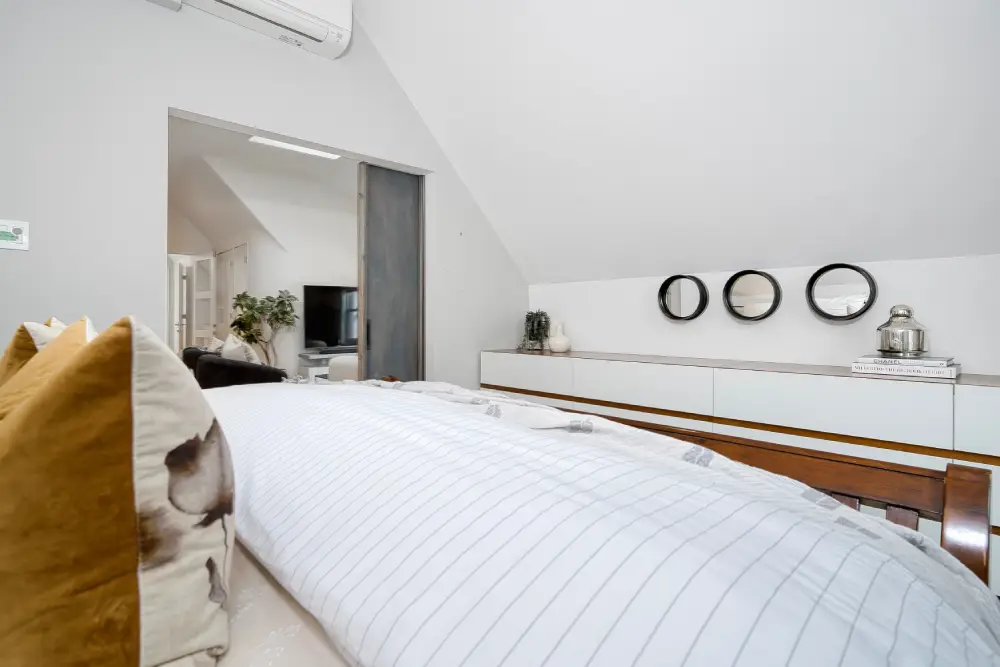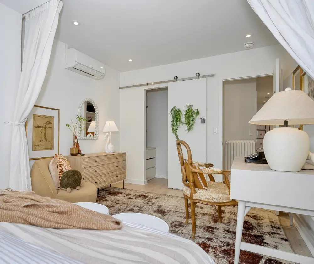 The bedroom brings a calm, grounded feel, enhanced by neutral tones and simple, refined furnishings. The renovated bathroom—with its spacious shower and contemporary finishes—creates an independent, self-contained suite that works beautifully for guests, in-laws, or as a private space with rental potential.